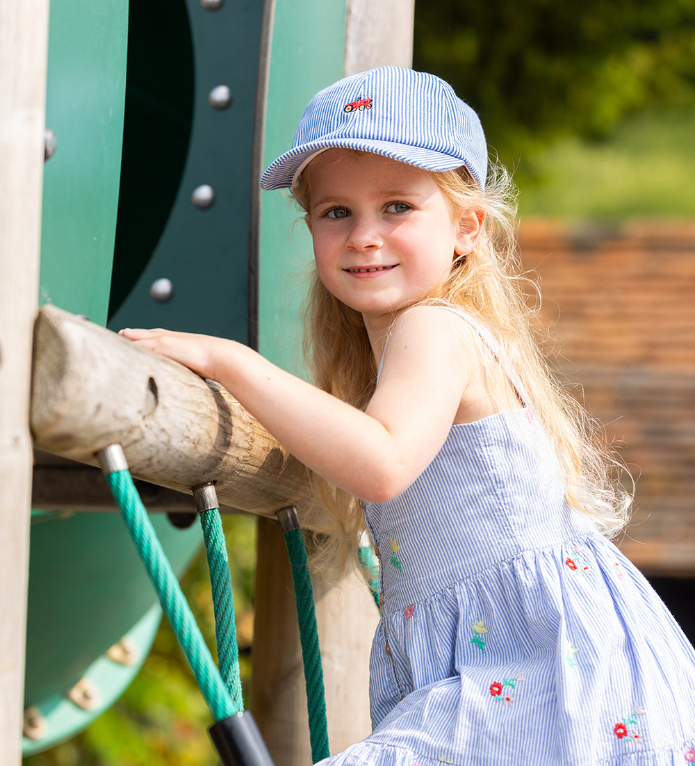 Keep little explorers cool and comfy with our Arthur the Tractor Cap, featuring cheerful blue stripes and Arthur’s friendly face stitched on the front. Designed for adventures big and small, it comes with a soft Velcro back for an easy, adjustable fit as they grow.